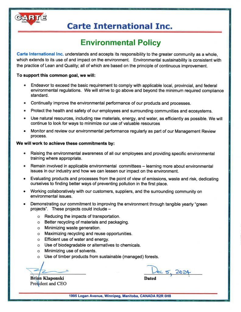 Carte has implemented sustainable practices into our business including minimizing energy use, installing plumbing fixtures and equipment that use less water, increasing the insulation or U-value of windows and doors, limiting solid waste through recycling and re-use, and properly controlling and disposing hazardous production by-products, such as scrap oil and paint sludge.