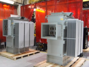 Carte makes a range of large single phase transformers for Utility and Industrial applications. These transformers are mounted on platforms or at ground level in secure locations. Many possible configurations are possible and retrofit applications to meet existing throat height dimensions are common. Bushings may be distribution class or power class bushings, meeting the bushing interchangeability requirements of IEEE or CSA.